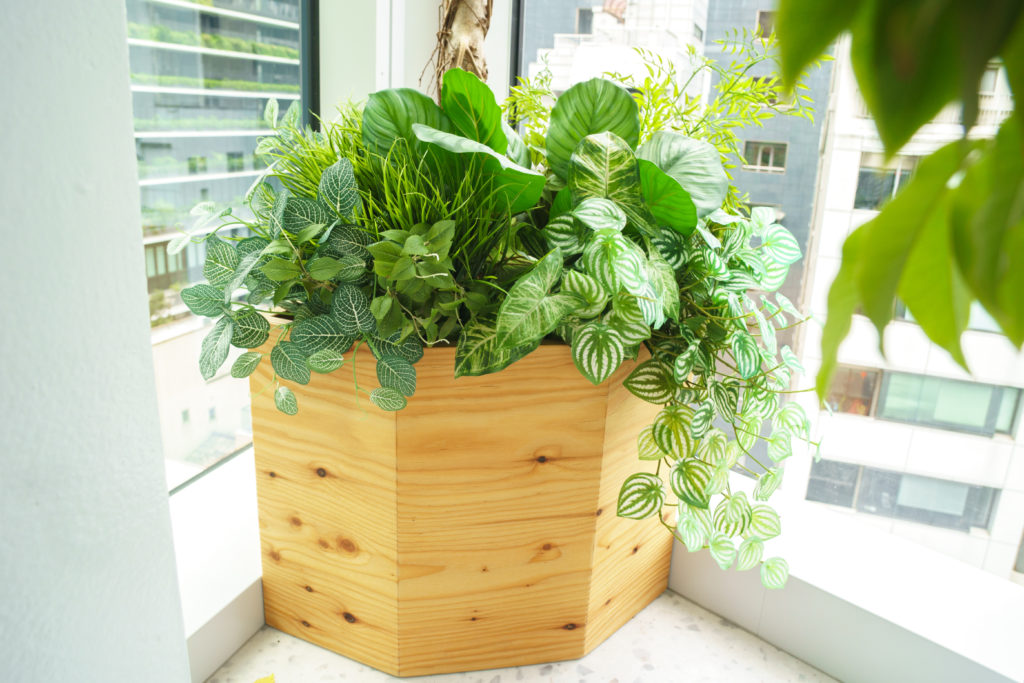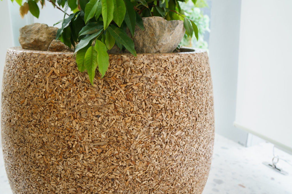 家具や建材として利用されなかった節の多いパイン材をアップサイクルし、深いブラウンに染め上げたプランターをセレクト。割れや節は自然素材の個性であり、空間に温もりと物語を添えています。