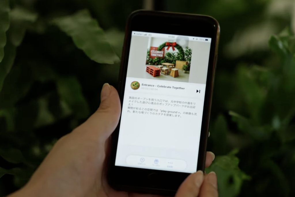 施設内数カ所に設置されたビーコンに来場者が近づくと、連動したアプリが反応し、施設の紹介や装飾の解説を表示する仕掛けを体験いただきました。