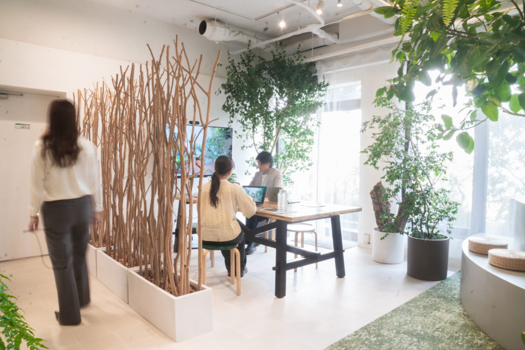 植栽の自然な質感が視界に入り、リラックスしながらも集中して業務に取り組める空間のご提案です。