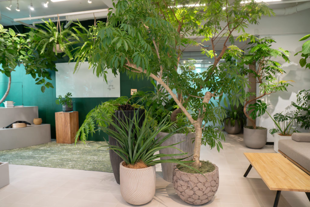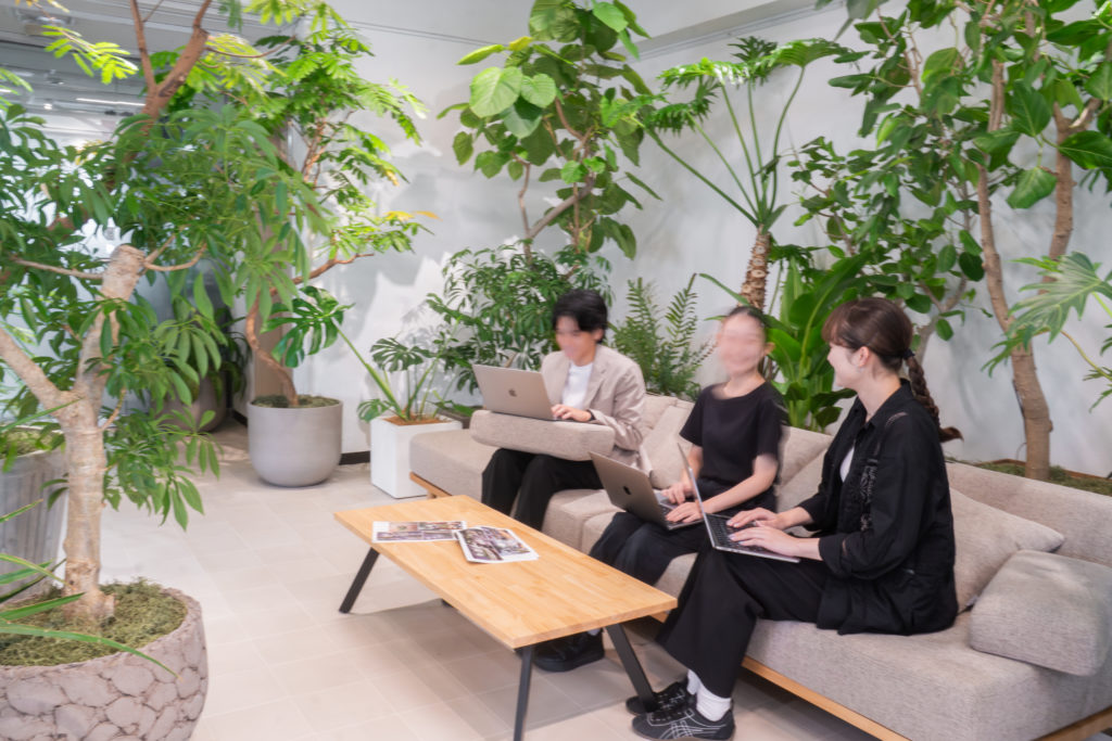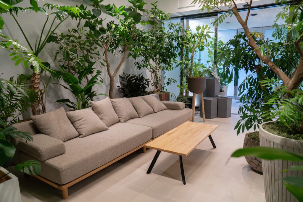 植栽とソファ、テーブルを組み合わせることで、人の動きや会話の流れも自然に生まれる空間としています。
