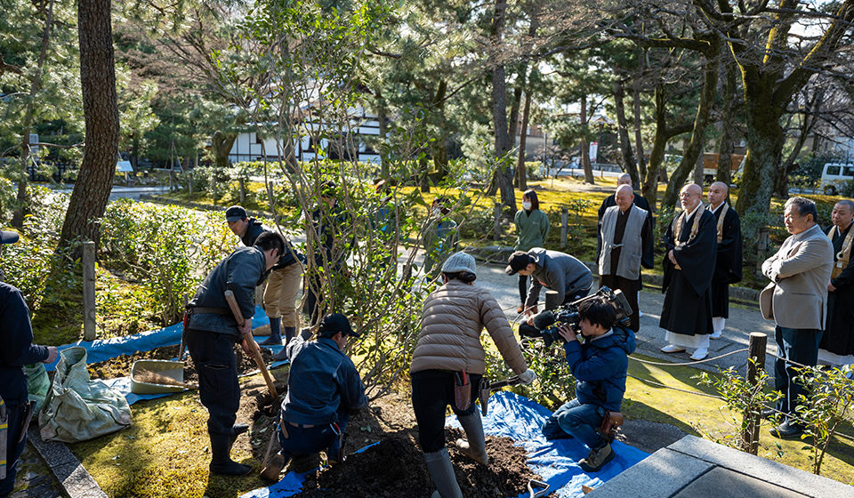 その発祥の地である建仁寺が、プロジェクトに参与。3月3日、グリーンディスプレイは静岡県掛川市の休耕地でお茶産業を支えたオチャノキを献納、植樹致しました。