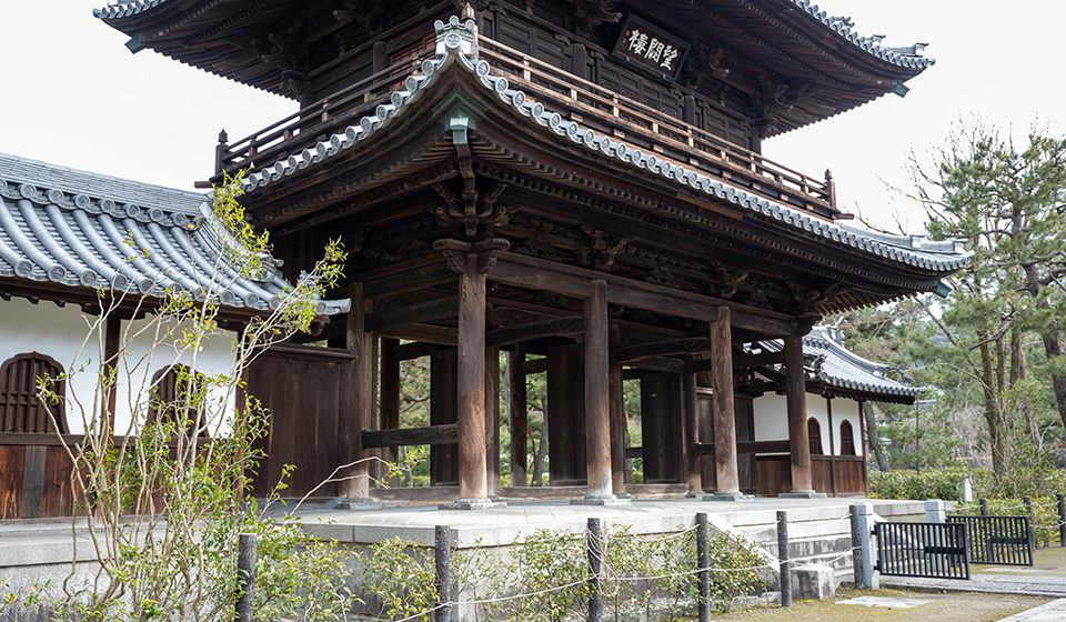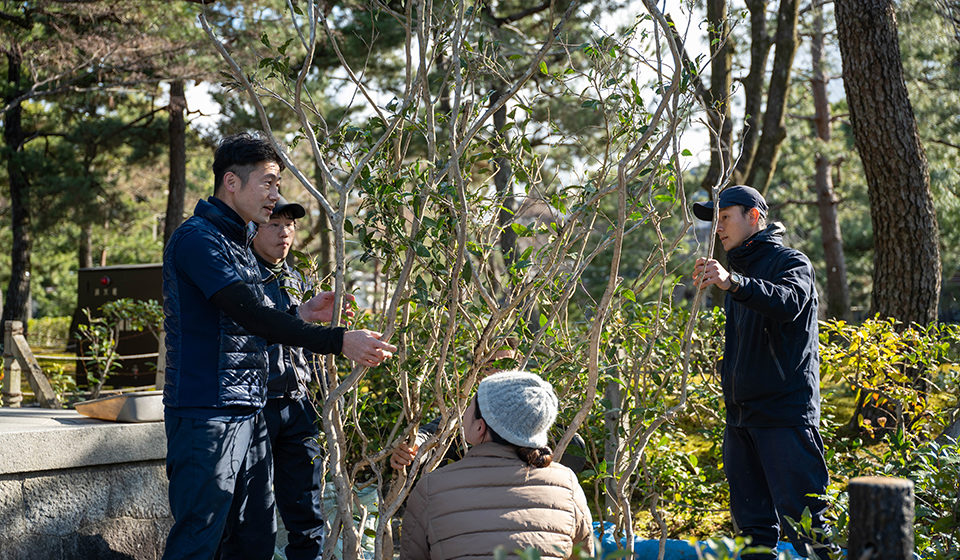 建仁寺は「風神雷神図屏風」で有名な寺院。4M級に生長した2本のオチャノキをその風神雷神に見立て、三門(望闕楼)の前に植樹致しました。
