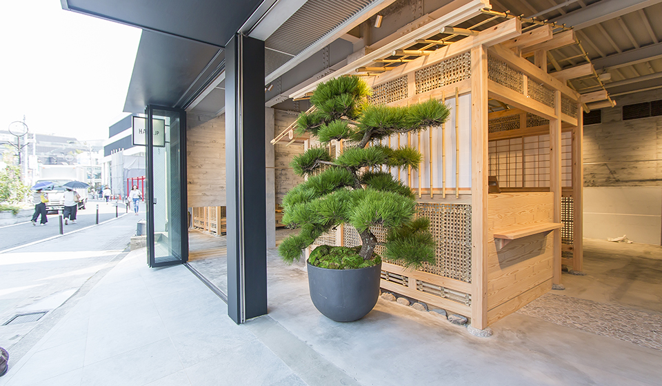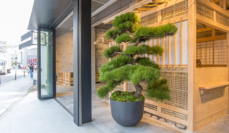 茶室をモチーフにした空間に、巨大な盆栽風の黒松を置くアイキャッチな提案は、GD.Labの取組みの一つでもあります。