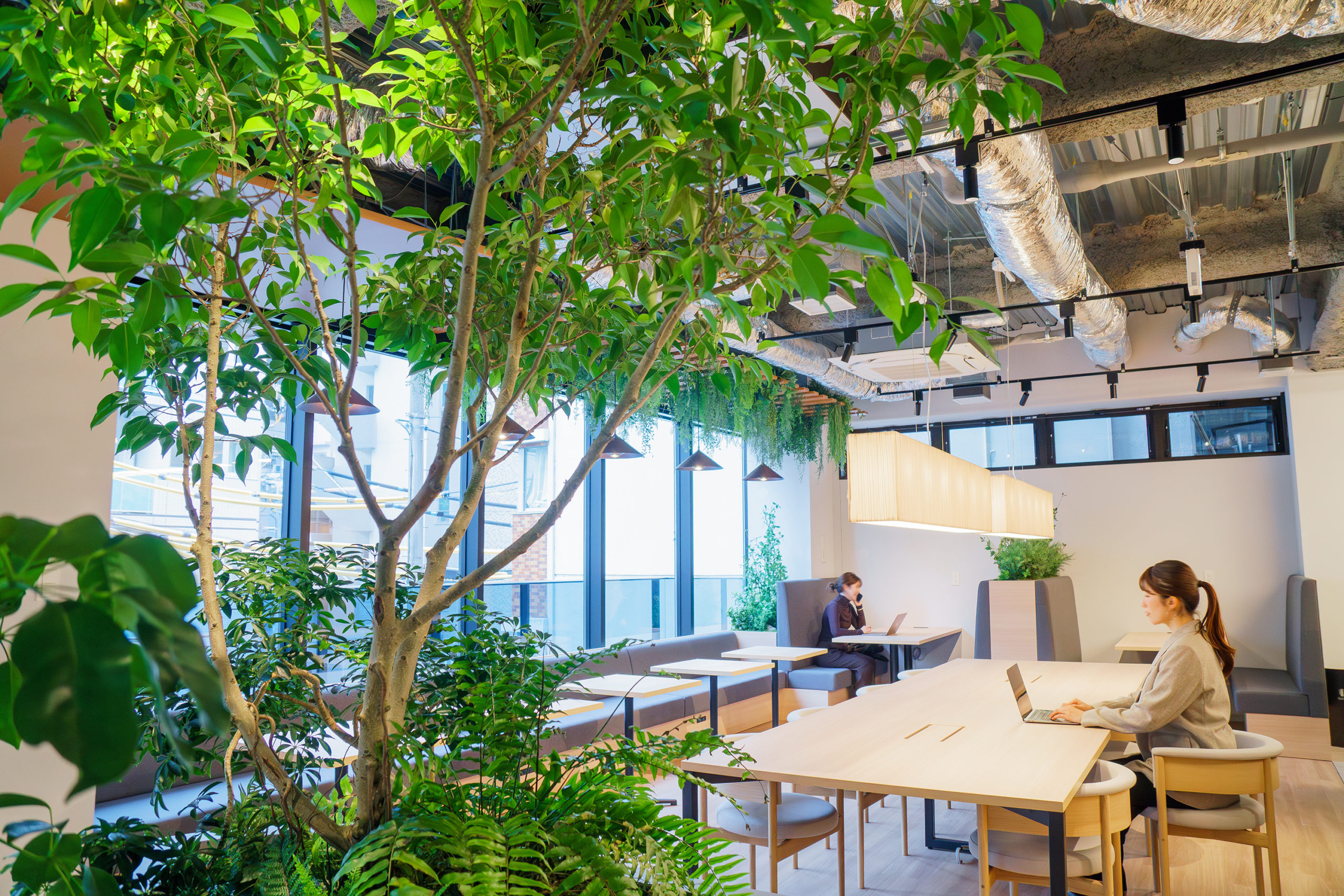 バイオフィリックデザインの考え方を取り入れ、自然の要素をオフィス空間に組み込むことで、働く人の集中力や創造性を高める環境づくりを行いました。