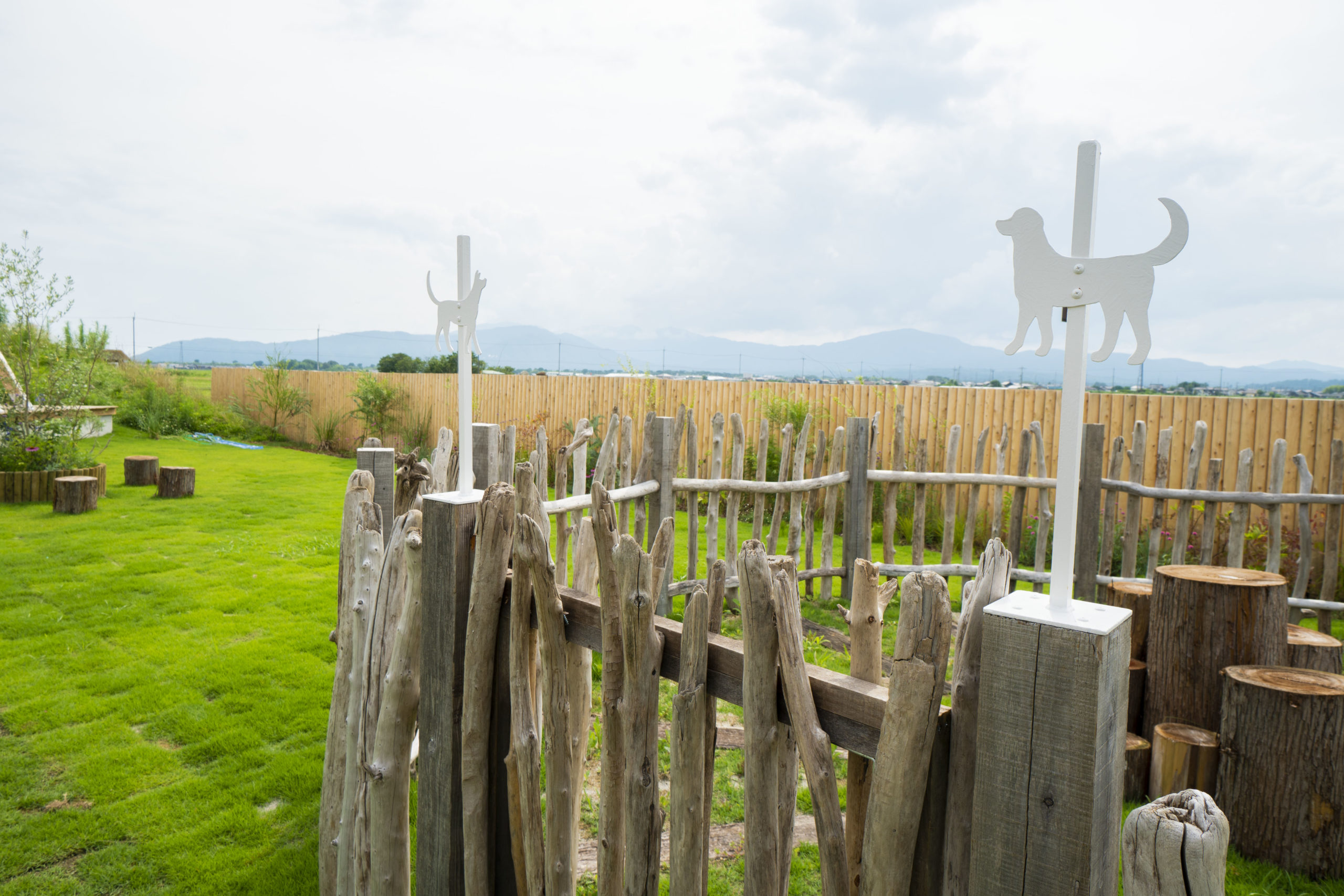 国産の白砂、流木の屋根、切り株などの自然の恵みと、古材レンガ畳み、コールテン鋼の壁など、拘りの素材で施工しました。