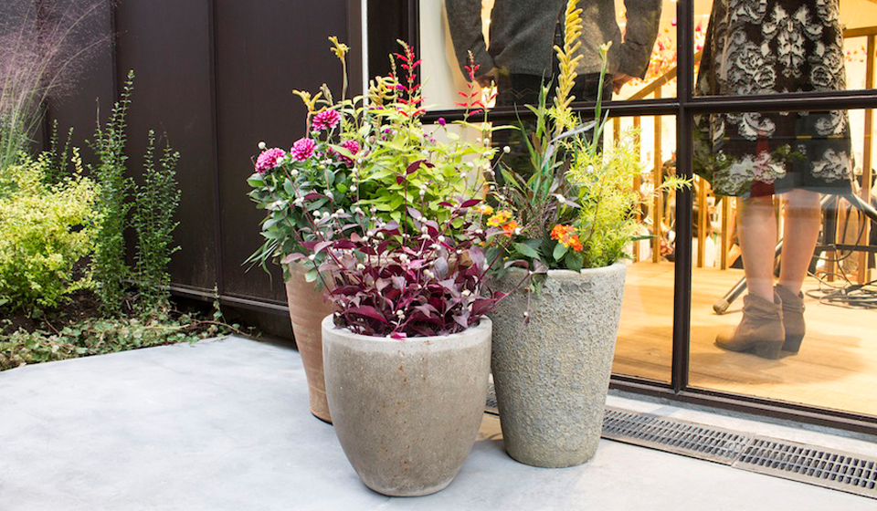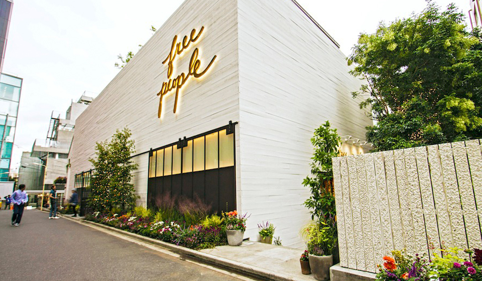 アパレルブランドfree people旗艦店である原宿店ファサードエリアのフラワーガーデン。各所に置かれた花鉢の寄せ植えと、イルミネーションを巻いた3本の常緑ヤマボウシをOPENに合わせて植えました。