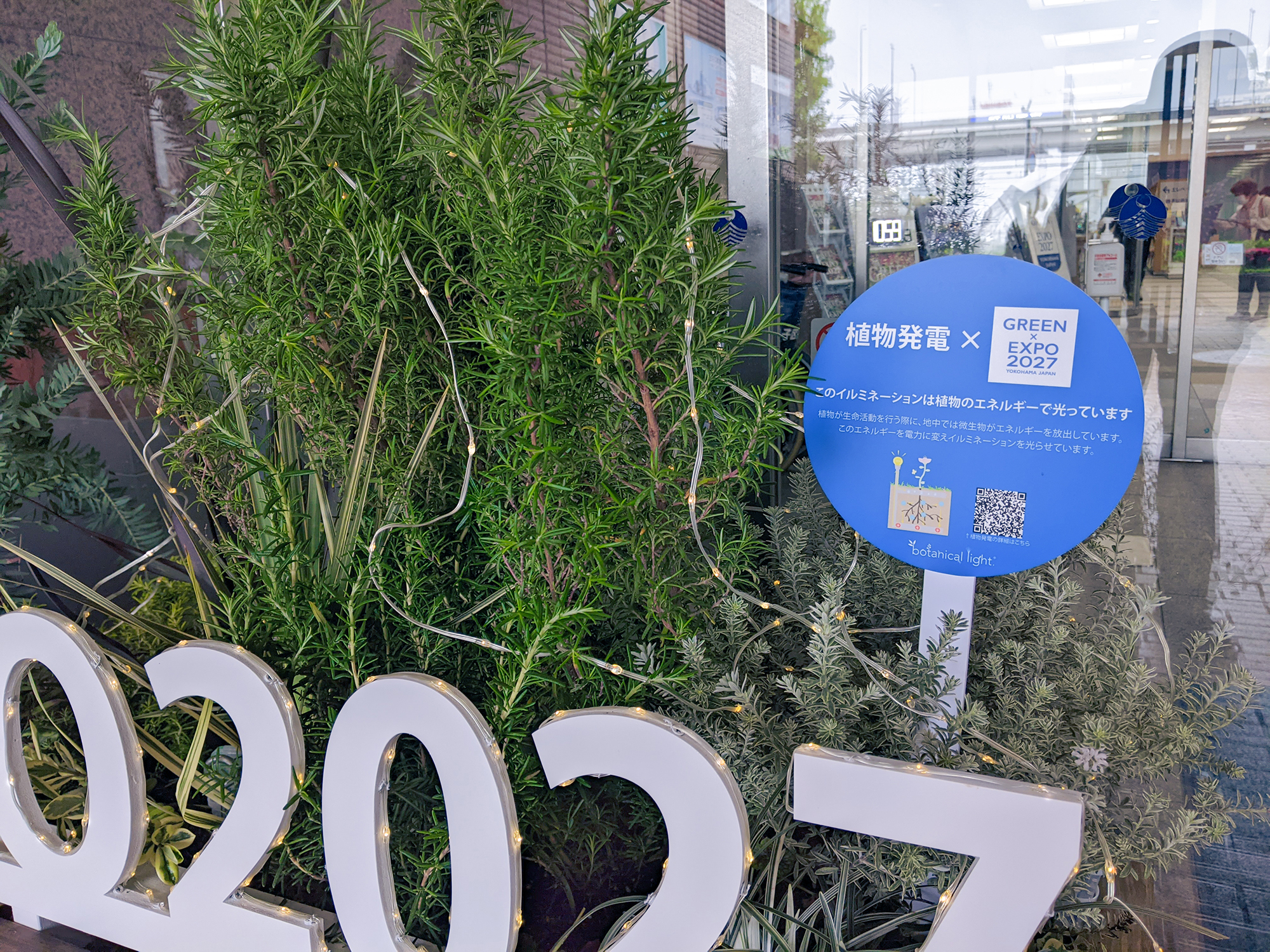 横浜市磯子区役所正面玄関にて2027年に開催される、国際園芸博覧会のロゴであるGREEN×EXPO 2027を植物発電ボタニカルライトで縁取り植栽と合わせてご提案をさせていただきました。
