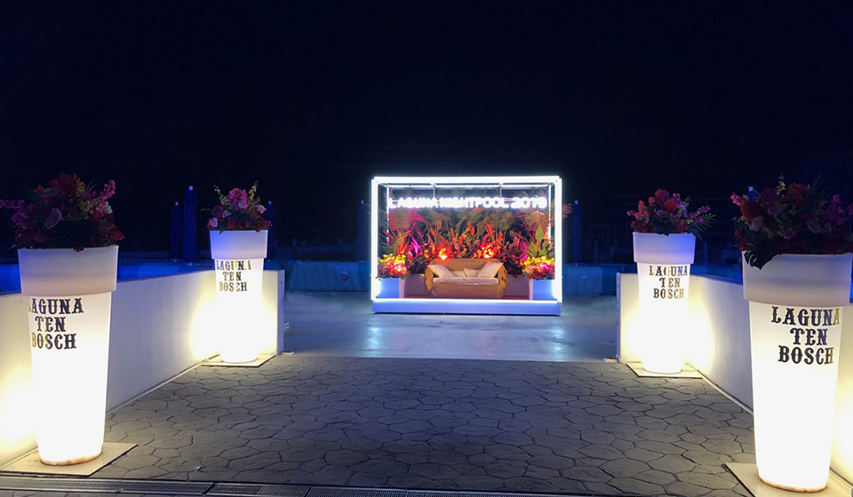 ナイトプールの雰囲気に合うラグジュアリーでボタニカルな植栽やネオンの装飾がポイントです。