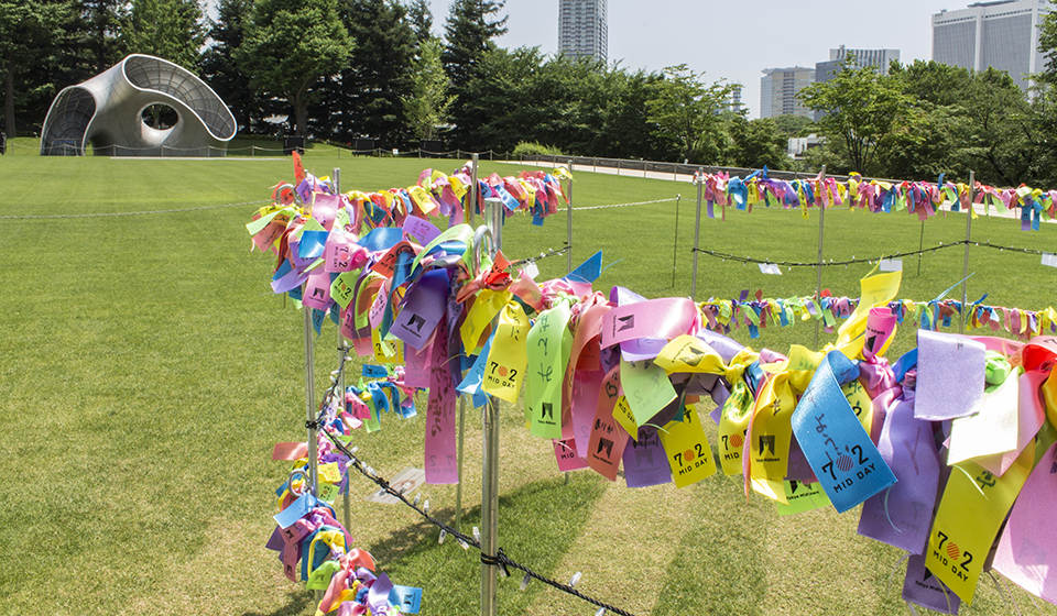 一年のまんなかの日を笑顔で迎える為にご用意された34個のサプライズの一つ 、ミッドデイリボンは参加型のイベントで、カラフルなリボンで作られたMIDDAYモニュメントにこれからの新しい半年を笑顔で過ごせる様、目標や祈願をリボンに込めて結びつけます。