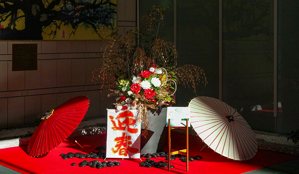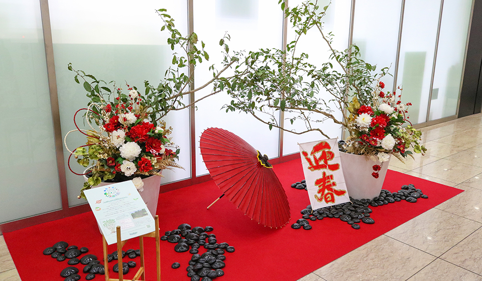 正月ということで、日本文化を感じられるお茶の木を使用した装飾を展開いたしました。