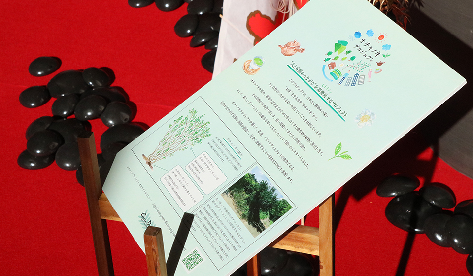また、お茶の木の周りに散りばめられた黒石は、自動車のハンドルを作製する際に廃棄されてしまう素材。